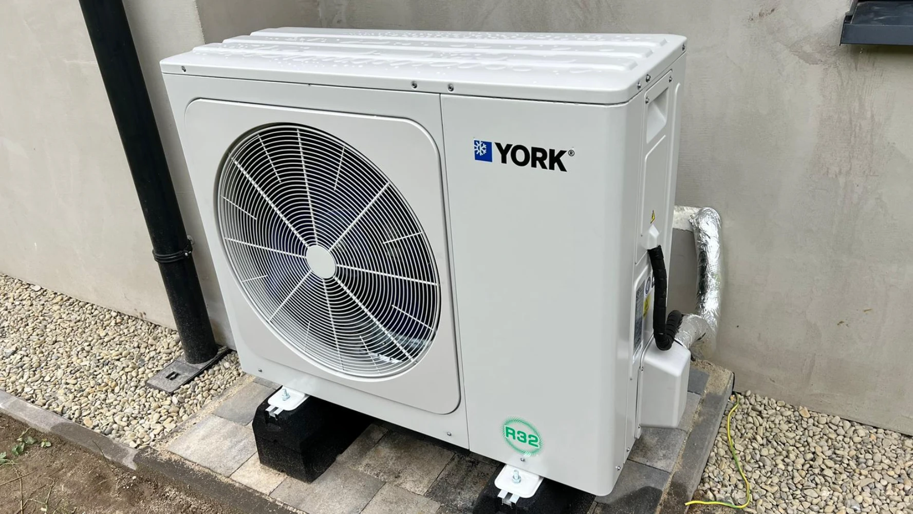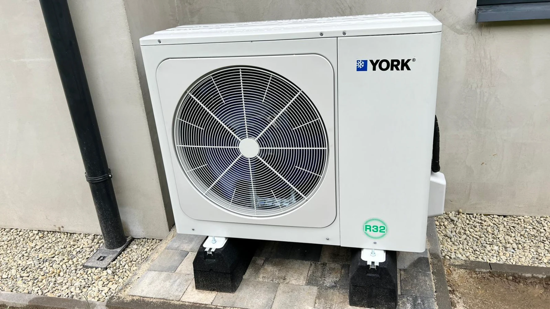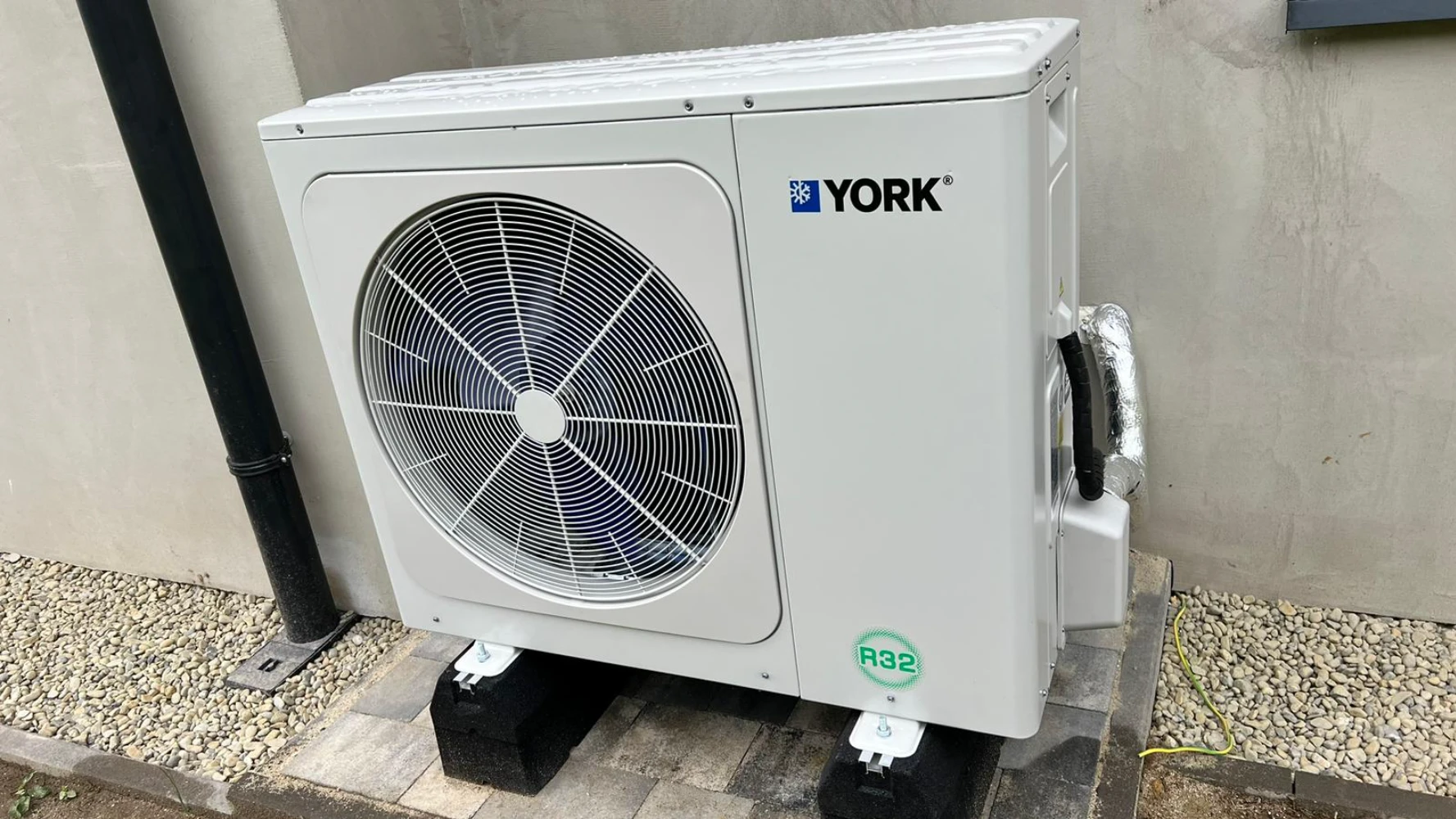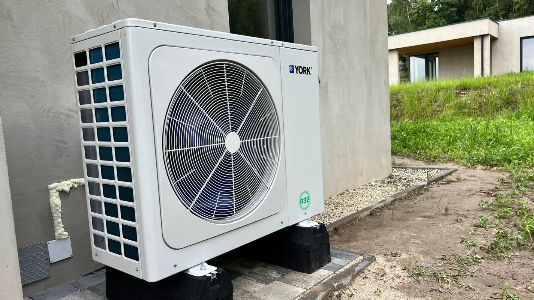 Pompa ciepła marki York, zainstalowana na zewnątrz budynku. Wykorzystanie czynnika chłodniczego R32 pozwala na zredukowanie wpływu na środowisko naturalne, a nowoczesne rozwiązania techniczne zapewniają cichą i bezawaryjną pracę urządzenia.